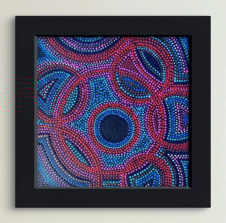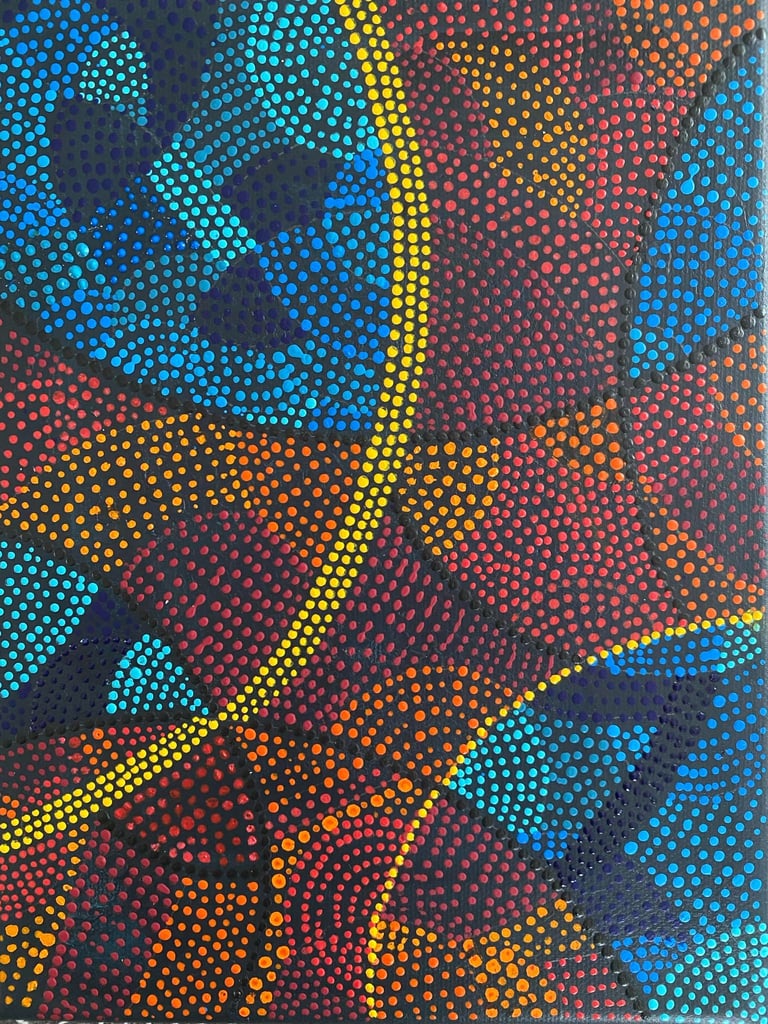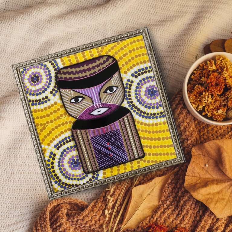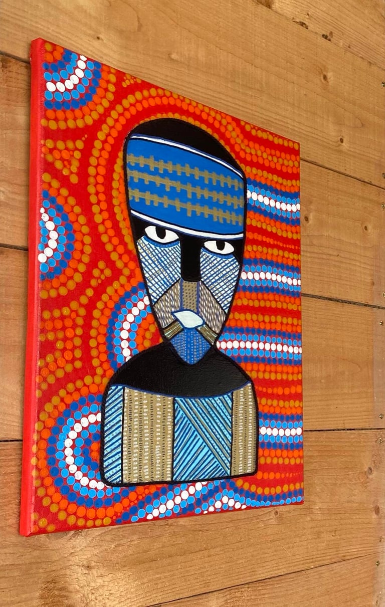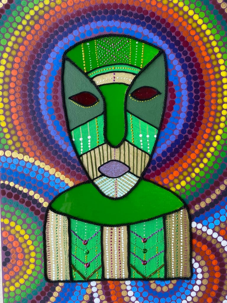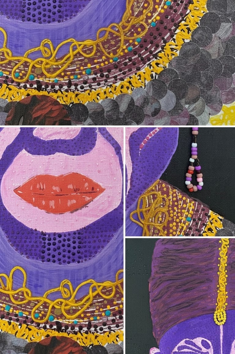 Je m'imprègne des techniques traditionnelles pour les mélanger et les réinterpréter. Je m'inspire de la richesse de leurs peintures, de leurs motifs de tissus, et de la symbolique de leurs statuettes ou poupées et fétiches... Je fonds tous ces éléments avec les couleurs que j'aime et j'ajoute des matières qui me parlent, comme des perles, des fils de coton et d'autres matériaux.